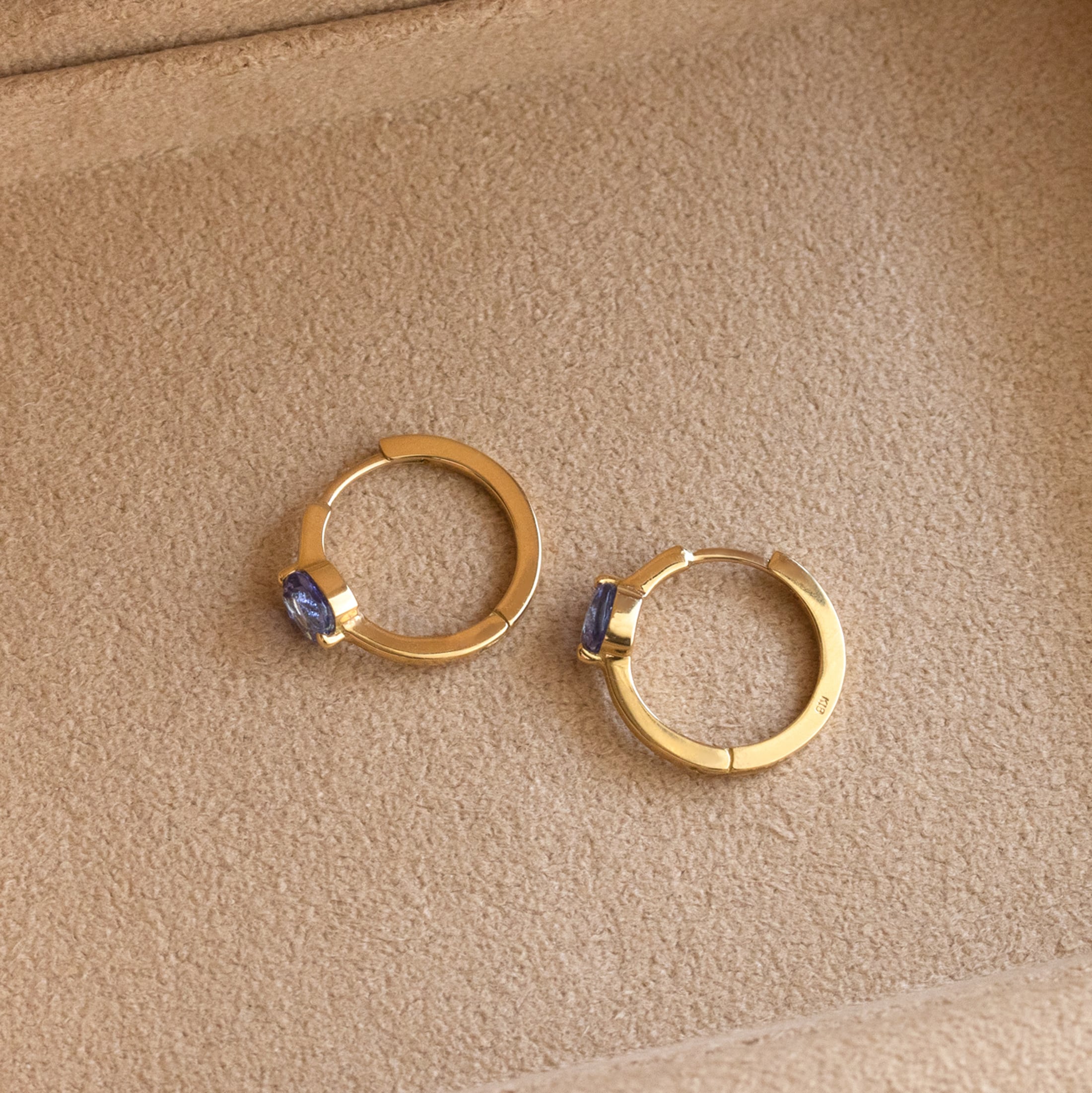 豊かな色合いが心を惹きつける、アフリカの宝石タンザナイトを小さなフープピアスにセッティングしました。